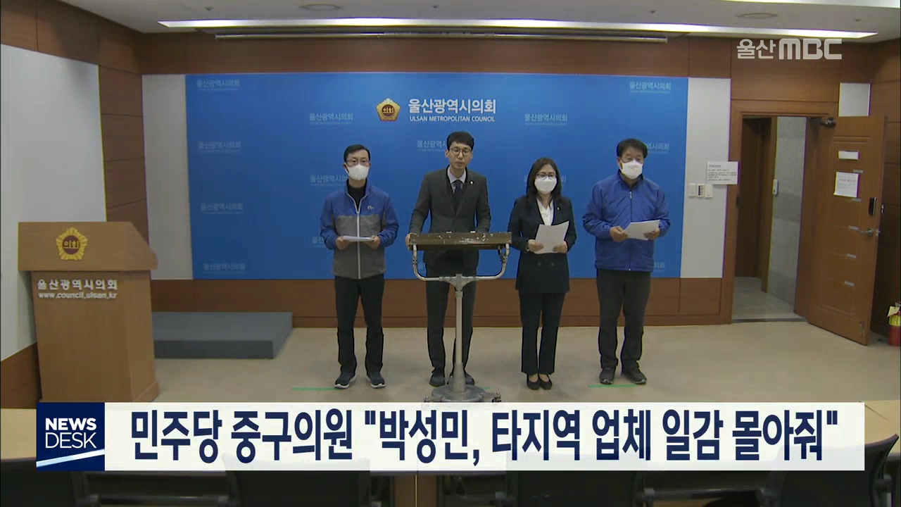 민주당 소속 중구의회 의원들은 오늘(4/10) 미래통합당 박성민 후보가 중구청장 재임 시절 경남 창원 소재 업체에 30억 원대의 일감을 몰아줬다고 주장했습니다. 또 당시 이 업체의 협력업체는 지금까지도 거래대금을 다 받지 못하고 있다고 덧붙였습니다. 이에 대해 박성민 후보 측은 특혜가 아닌 법률에 근거한 정상적인 ...