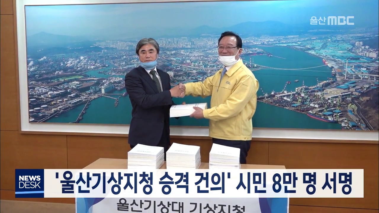 울산기상대를 기상지청으로 승격해달라는 울산시민 서명이 8만 명을 넘어섰습니다. 울산시는 울산기상지청 승격 범시민 추진위원회가 올해 2월까지 진행한 서명운동에 8만3천 명이 동참했다고 밝혔습니다. 울산시는 이번달 기상청을 방문해 울산기상대의 지청 승격을 건의하고 서명부를 전달할 계획입니다. //