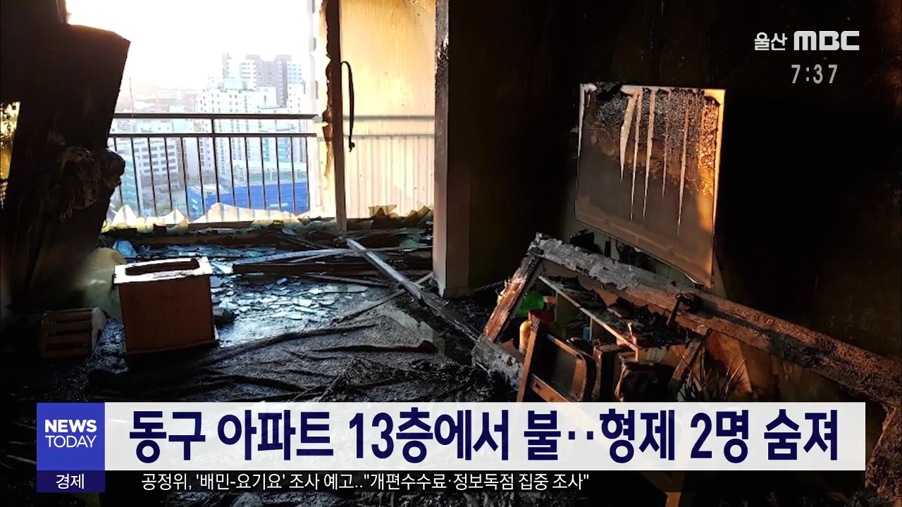 오늘(4/8) 새벽 4시 10분쯤 울산 동구의 한 아파트 13층에서 불이 나 청소년과 어린이 등 형제 2명이 숨졌습니다. 소방당국에 따르면 18살 김 모 군은 아파트에서 추락해 숨졌고, 9살 김 모 군은 집 안에서 숨진 채 발견됐습니다. 또 아파트 주민 8명이 연기를 흡입해 병원에서 치료를 받았습니다. 경찰과 소방당국은 화재 ...