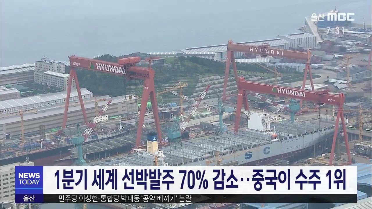 1분기 세계 선박발주량이 지난해 같은 기간의 3분의 1로 이하로 줄어들었습니다. 영국의 조선해운시황 분석기관 클락슨리서치에 따르면 1분기 세계 선박 발주량은 233만CGT로 1년 전에 비해 71% 줄었으며, 국가별로는 중국이 65%를 수주하며 1위, 한국은 16%를 수주해 2위를 차지했습니다. 이는 발주 물량 감소속에 중국의 ...