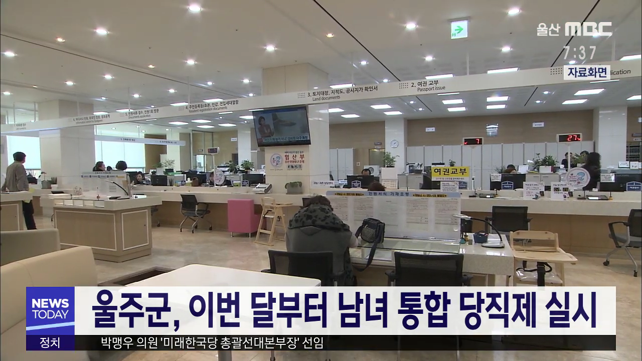 울주군이 이번 달부터 당직 근무에 남성과 여성 공무원이 모두 참여하는 통합 당직제를 실시합니다. 울주군은 그동안 주말과 공휴일 주간 근무는 여성이, 평일 야간 근무는 남성이 맡도록 했지만 여성 공무원 비율이 늘고 당직 근무에 성별 구분이 불필요하다는 인식이 늘어나 통합 당직제를 시행하게 됐다고 밝혔습니다. ...