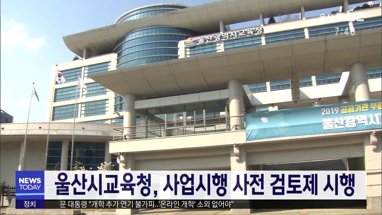 울산시교육청은이 다음달부터 사업시행 사전 검토제를 시행합니다. 사업시행 사전 검토제는 주요 정책이나 사업 추진 전에 대상자의 의견이나 관련 법규, 갈등 발생 가능성 등을 사전에 점검하는 제도입니다. 이 제도는 교육감이 결재하는 주요 정책과 신규 사업 등에 우선 적용됩니다.//