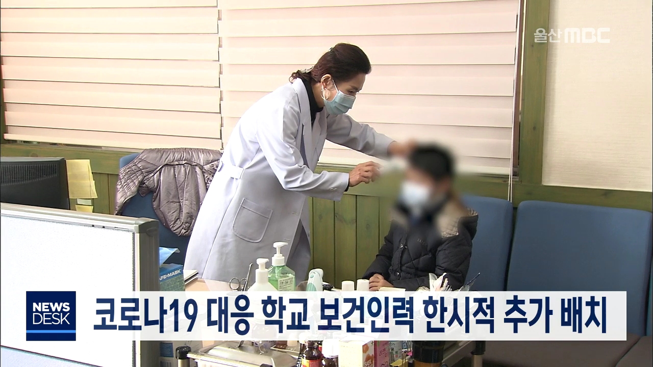울산시교육청은 현재 모든 학교에 배치돼 있는보건교사에 더해 코로나19에 대한 신속한 대응을 위해 한시적으로 추가 보건인력을 배치합니다. 지원대상 학교는 학생수 800명 이상인 초등학교 34개, 중학교 5개, 고등학교 6개 등 45개 학교이며, 지원인력은 4개월간 보건교사를 도와 발열체크와 마스크 착용 지도 등의 업무...