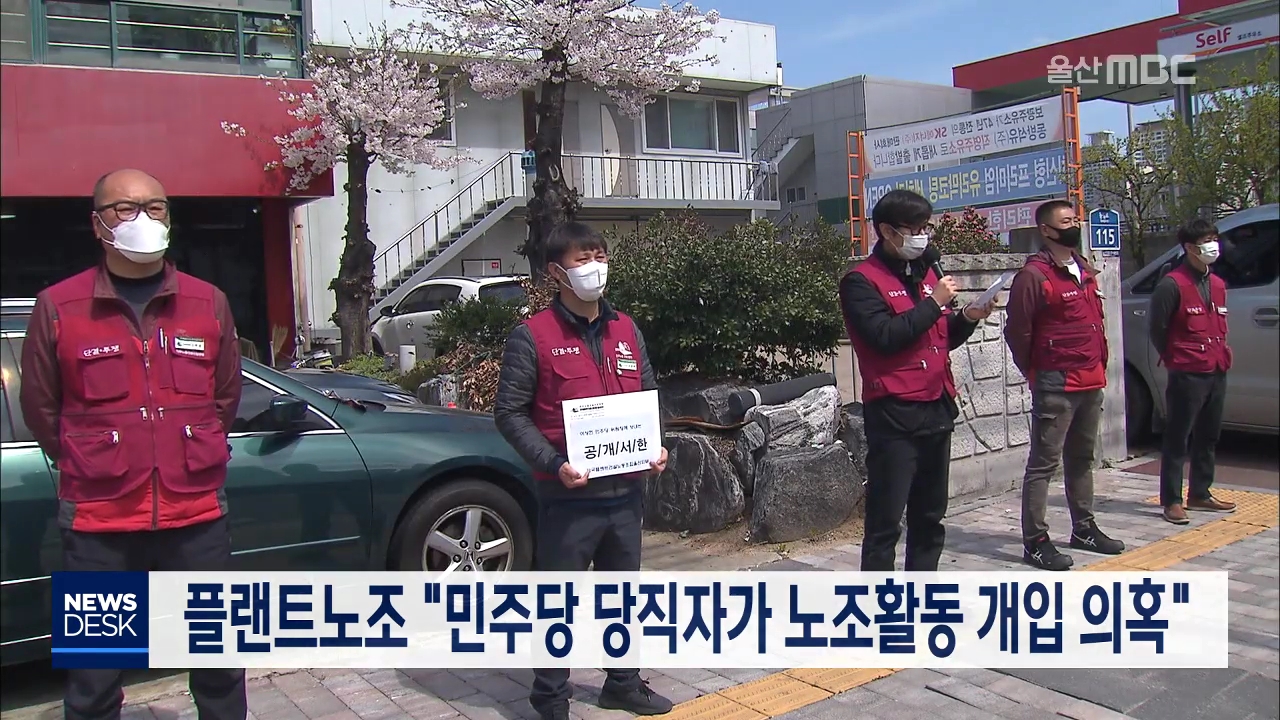 전국플랜트건설노조는 오늘(3/30) 기자회견을 열고 더불어민주당 울산시당의 일부 당직자가 노조 내 특정 조직을 지원하고 노조 선거에 개입했다는 의혹을 제기했습니다. 노조는 지난해 임원선거 당시 특정 조직 후보가 민주당 당원인 점을 이용해 시의원과 경제부시장을 면담한 뒤 이를 홍보에 이용하고, 민주당 당직자가 ...