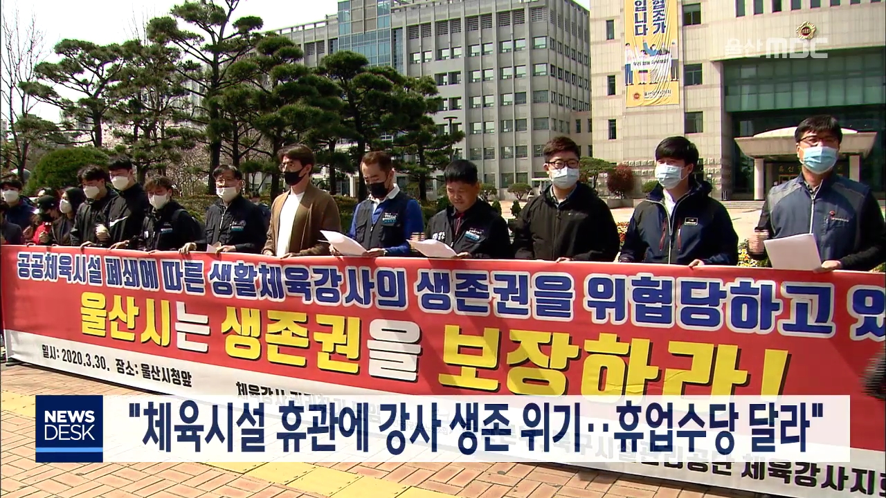 민주노총 공공운수노조 울산본부는 코로나19 유행으로 문을 닫은 지역 공공 체육시설 체육강사들에게 휴업수당을 지급해야 한다고 요구했습니다. 이들은 체육시설이 휴관하면 강사들이 수입을 전혀 올릴 수 없어 생계에 큰 타격을 받는데도 일방적으로 휴관 결정이 내려졌고, 체육시설 내 사무직 등 다른 직원들이 받는 휴...