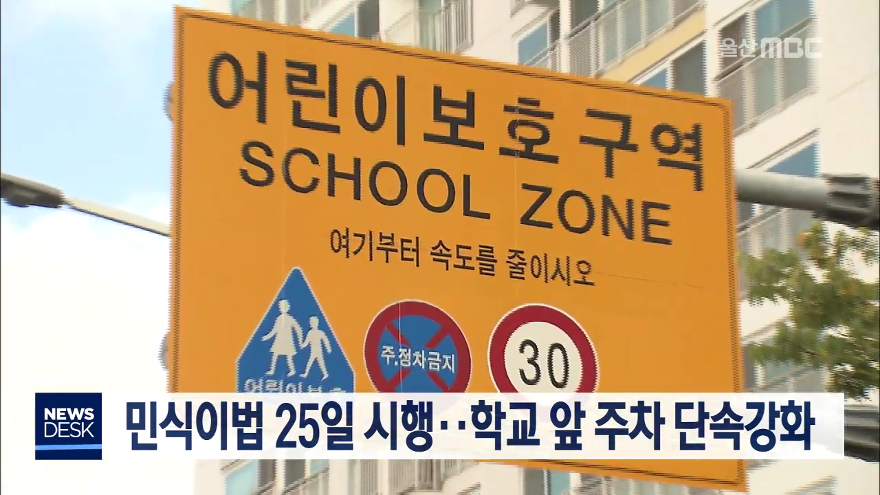 어린이보호구역에서 아동 교통사고를 낼 경우 처벌을 강화하는 민식이법이 오는 25일 시행되는 가운데 경찰이 불법 주정차 단속을 강화합니다. 울산 경찰청은 민식이법 시행에 따라 사고 위험이 큰 초등학교 주변에 무인단속 카메라를 우선 설치하고, 2022년까지 모든 어린이보호구역에 무인단속 카메라를 설치할 계획입니...
