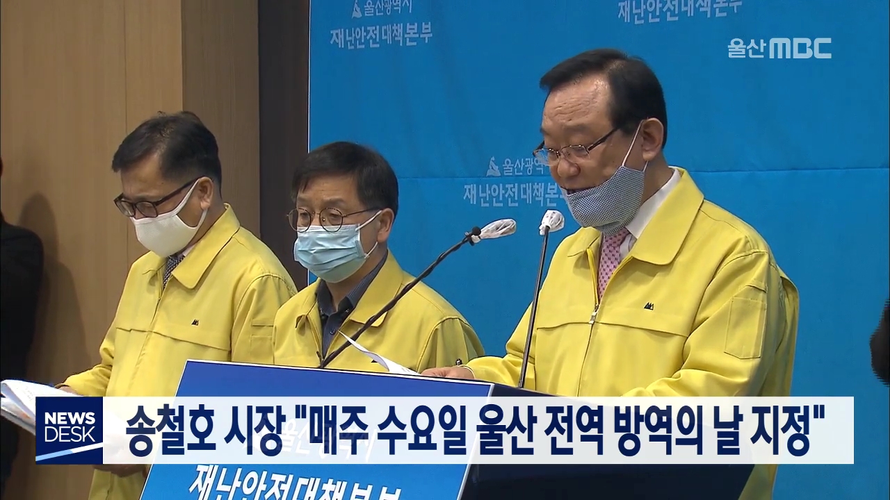 울산시는 코로나19 확산을 막기 위해 매주 수요일을 방역의 날로 지정·운영하기로 했습니다. 송철호 시장은 오늘(3/16) 코로나19 일일 브리핑에서 매주 수요일 오후 5시 방역을 실시하고, 덴탈 마스크 100만개를 중국업체로부터 수입해 내일(17) 오전 11시부터 배분한다고 밝혔습니다.//