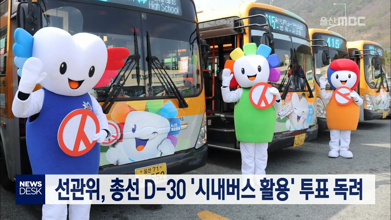 울산시선거관리위원회가 4.15 총선 투표 참여를 독려하기 위한 홍보수단으로 시내버스를 활용하기로 했습니다. 선관위는 내일(3/16)부터 신도여객이 운행하는 415번을 비롯한 500대의 시내버스에 홍보 캐릭터와 선거 정보를 부착하고 버스에서 선거 안내방송도 할 계획입니다. 선관위는 또 총선 30일을 앞두고 앞으로 선거...