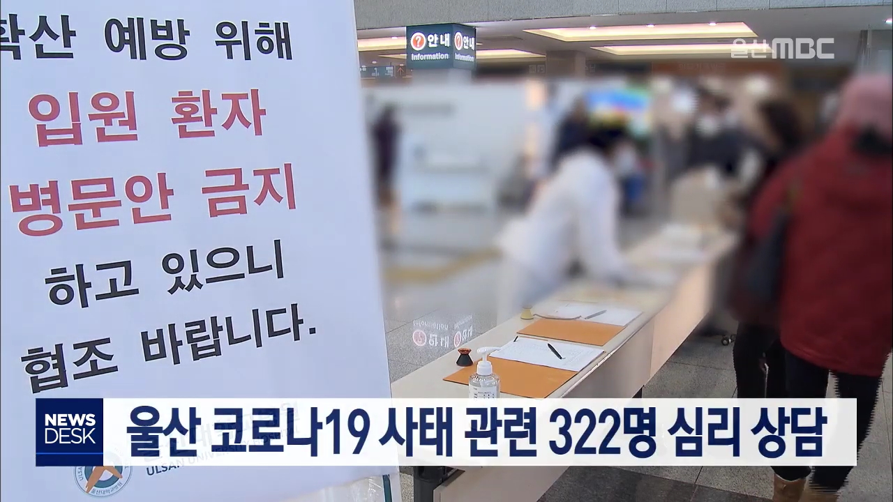 코로나19 울산 확진자와 접촉자를 위한 심리 상담 지원이 이어지고 있습니다. 울산시는 코로나19 사태 발생 이후 지난 달 10일부터 오늘(3/8)까지 지역에서 발생한 확진자를 비롯해 가족, 접촉자, 일반인 대상 상담을 받은 사람은 모두 322명이라고 밝혔습니다. 확진자나 가족의 경우 국가트라우마센터 핫라인을 자가 또는 ...