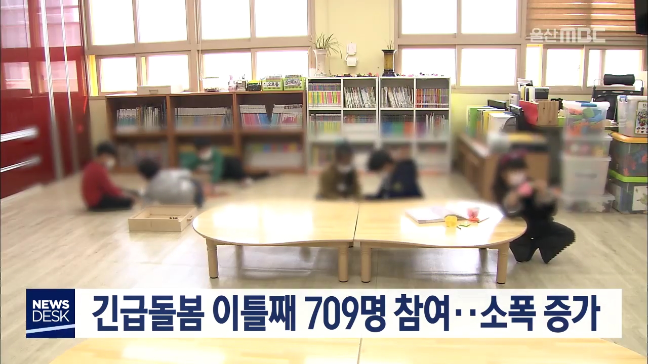 코로나19 여파로 개학이 연기되면서 실시되는 유치원과 초등학교 긴급돌봄 참여 학생 수가 소폭 늘어났습니다. 울산시교육청은 긴급돌봄 이틀째인 오늘(3/3) 유치원은 387명, 초등학교는 322명이 참여해 첫날인 어제에 비해 60여 명 늘어난 709명이 긴급 돌봄을 이용했다고 밝혔습니다. 개학 연기 여파에 따라 실시하는 긴...
