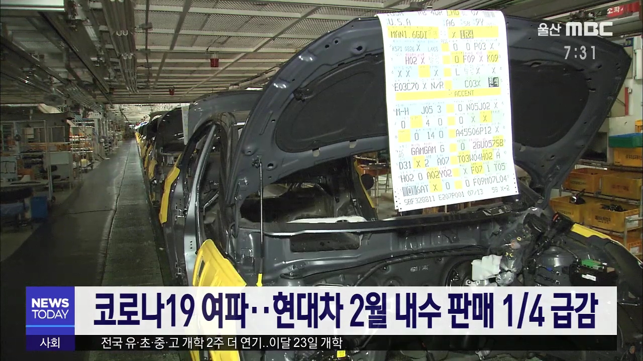코로나19 여파로 인한 생산 차질과 수요 위축으로 현대차의 지난달 국내 판매가 1/4 급감하는 등 전 세계 판매량이 12.9% 줄었습니다. 현대차의 지난달 판매량은 지난해 같은 기간에 비해 26.4% 감소한 3만 9천여 대로 집계됐으며, 해외 시장에서도 판매량이 10.2% 줄어든 23만 5천700여 대에 그쳤습니다. 2월 실적이 급감...