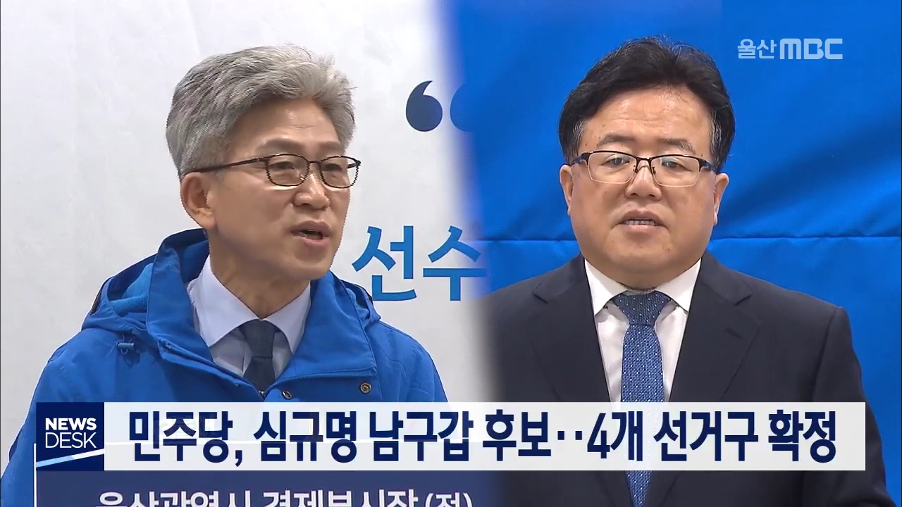 더불어민주당 심규명 전 울산시당위원장이 당내 경선에서 송병기 전 경제부시장을 따돌리고 승리해 이번 총선에 남구갑 후보로 나서게 됐습니다. 이로써 민주당은 남구갑에 심규명, 남구을에 박성진, 북구 이상헌, 울주군 김영문 후보를 확정했습니다. 민주당은 아직 후보를 정하지 못한 중구는 임동호-김광식 예비후보간 ...