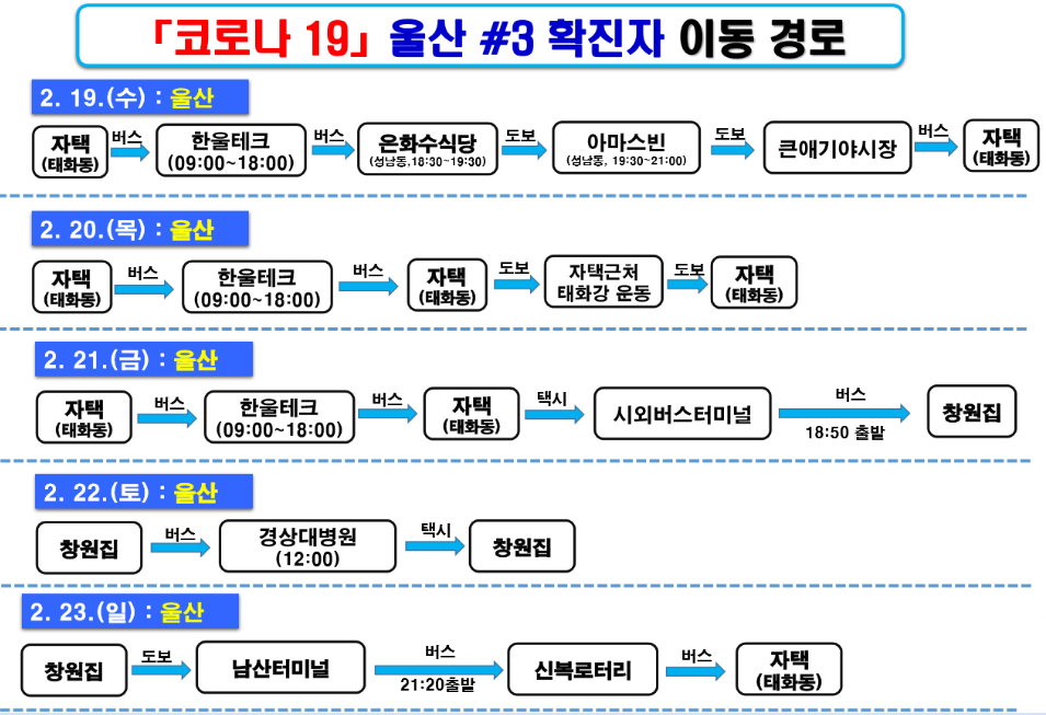 ※ 심층역학조사 중으로 추후 동선 변경될 수 있음 □ 확진환자 ○ 인적사항 : 여(만61세)/ 남목1동 거주 □ 이동경로 및 추진경과 ○ 2. 17.(월) 경산 자녀집 방문(버스 이용) ○ 2. 20.(목) 울산 자택 귀가 19시경 (경산 4시 20분 출발 시외버스 이용, 401번 시내버스로 귀가 ) ○ 2. 21.(금) ...