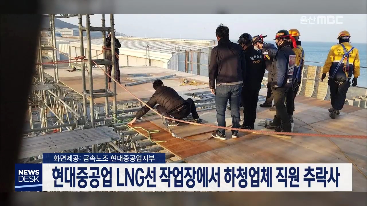 어제(2/22) 오후 2시쯤 현대중공업 내 LNG선 작업장에서 하청업체 직원 62살 김모 씨가 15m 아래로 떨어져 병원으로 옮겨졌지만 숨졌습니다. 김씨는 LNG선 탱크 내부 작업을 위한 발판 구조물을 조립하던 중 고정되지 않은 발판을 밟아 추락한 것으로 추정됩니다. 경찰과 고용노동부는 업체 관계자들을 상대로 정학한 사고 ...
