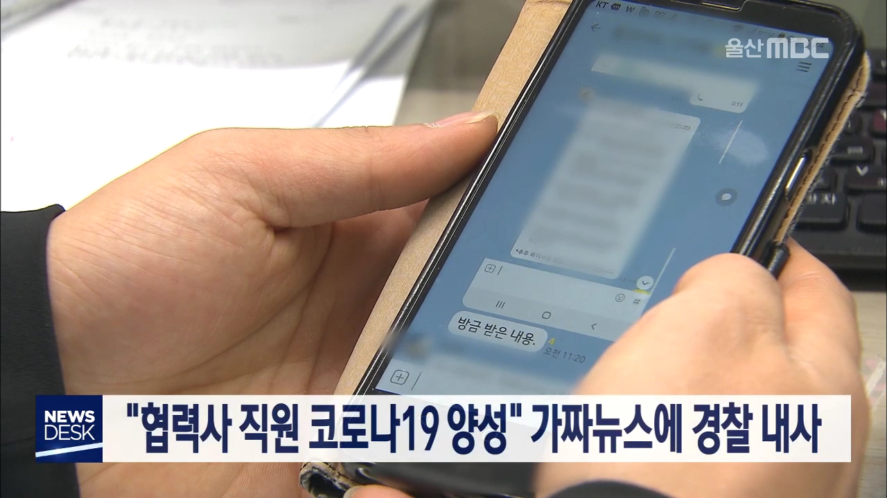 울산의 한 대기업 협력업체 직원이 코로나19 양성 판정을 받았다는 '가짜뉴스'가 퍼져 경찰이 내사에 나섰습니다. 오늘(2/22) 울산지역 인터넷카페와 SNS 등에는 모 대기업 협력업체 직원이 청도 대남병원에 병문안 갔다가 양성 판정을 받았다는 글이 나돌았습니다. 여기에는 직원의 거주지와 성, 나이도 적혀 있는데, 이 ...