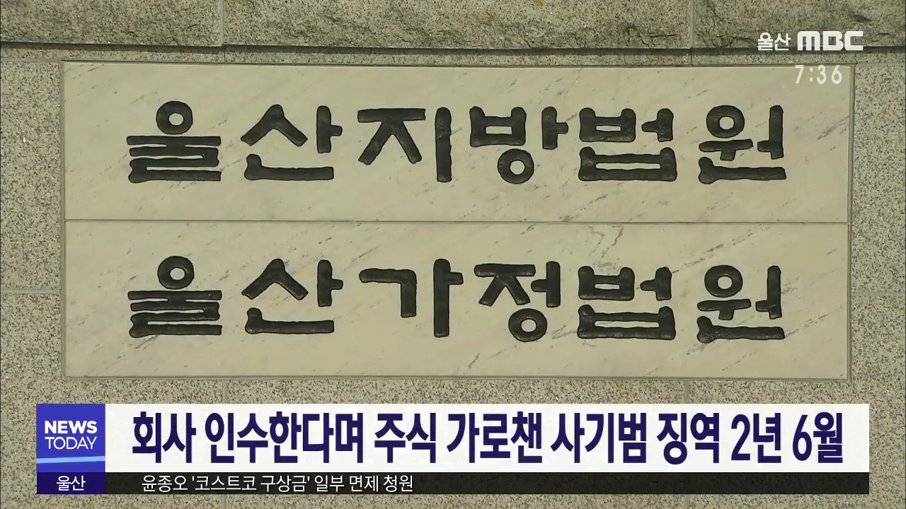울산지방법원 제11형사부는 사기 혐의로 기소된 54살 A씨에게 징역 2년 6개월을 선고했습니다.A씨는 지난 2016년 경북 경주시에서 테마파크 건축 공사를 하던 모 회사를 인수한다며 13억 원 상당의 회사 주식30만 주를 받아 가로채고, 크루즈선박 납품계약 체결에 돈이 필요하다고 속여 2명으로부터 1억 6천만 원을 받은 혐...