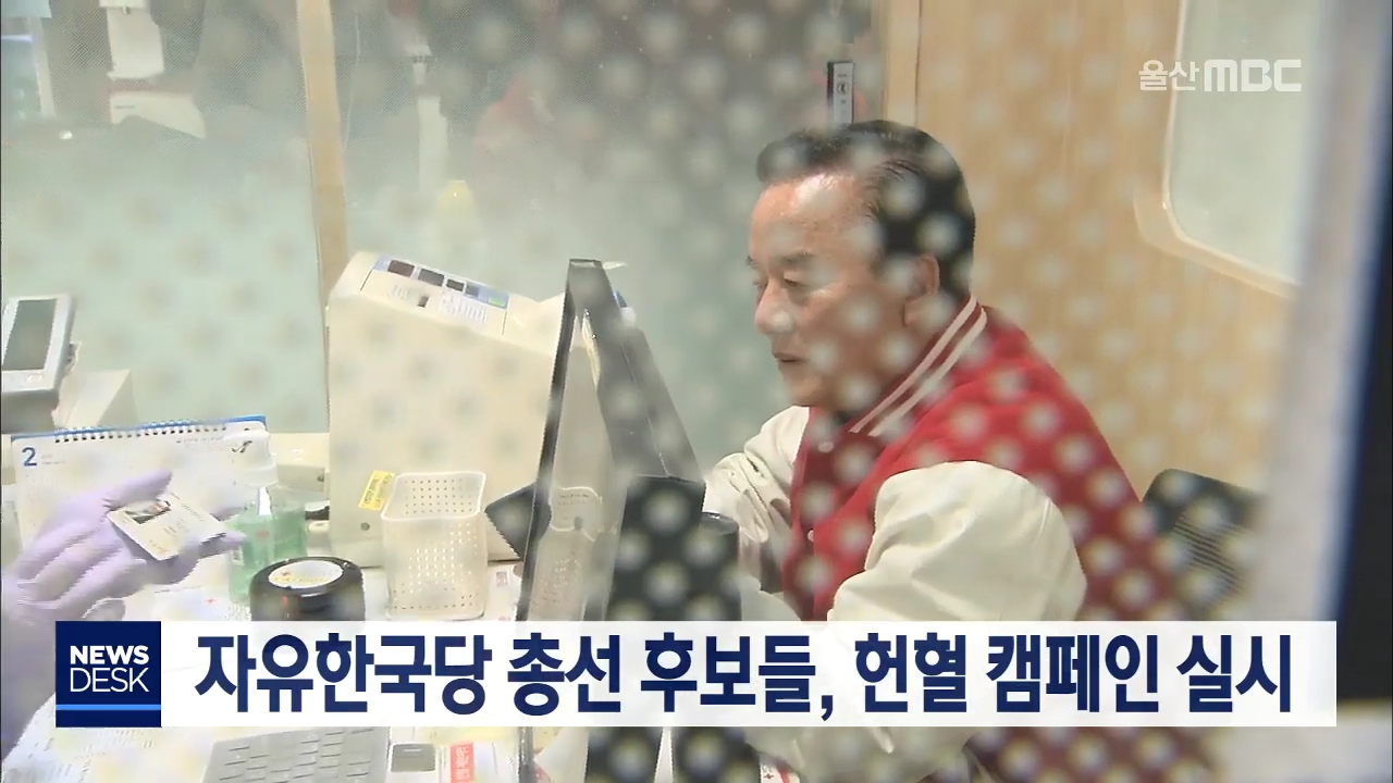 겨울철 혈액 수급에 비상이 걸린 가운데 자유한국당 울산시당은 오늘(2/10)중구 성남동 헌혈의 집에서 헌혈 캠페인을 실시했습니다.캠페인에는 정갑윤 시당위원장과 당직자,당내 총선 예비후보들이 참여했습니다.한국당은 모든 당원들에게 헌혈 릴레이에 동참하고 SNS를 통해 혈액 부족 사태를 주변에 알려달라고 당부했습...