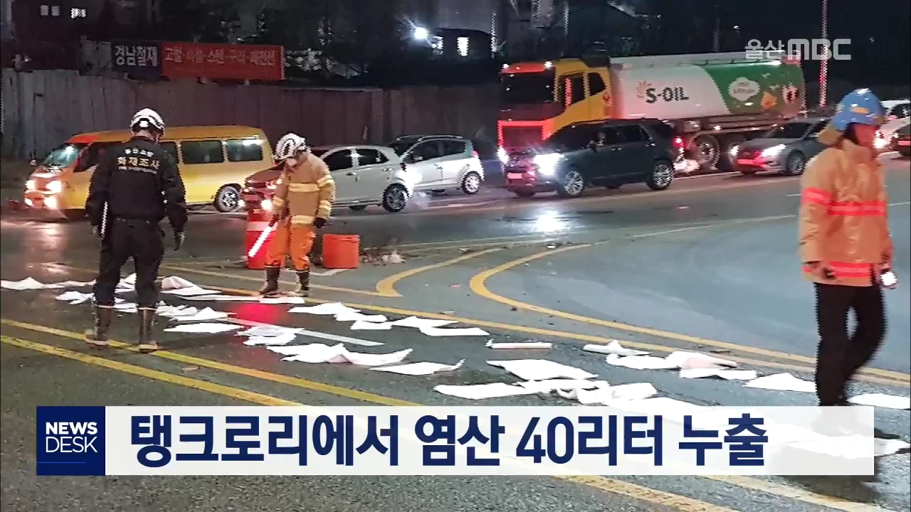 오늘(2/5) 새벽 6시 10분쯤 울주군 온산읍이 한 교차로에서 염산을 운반하던 탱크로리에서 염산 40리터 가량이 누출됐습니다. 신고를 받고 출동한 특수화학구조대와 소방당국은 도로에 흡착포를 깔고 중화제 등을 사용해 누출된 염산을 1시간 만에 제거했으며, 사고 차량 운전자를 상대로 자세한 누출 경위를 조사하고 있습...