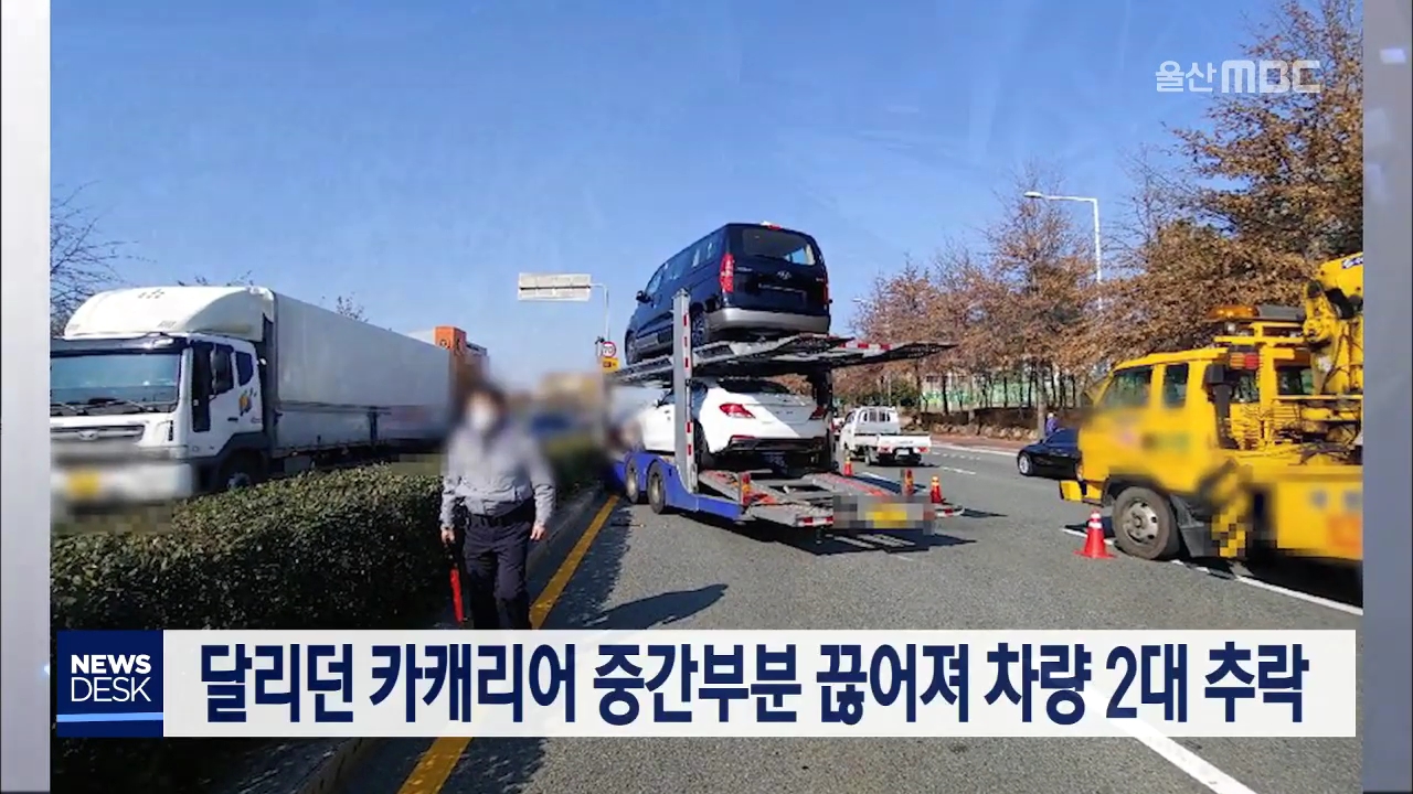 오늘(2/3) 오후 1시 40분쯤 북구청 앞 산업로를 달리던 카캐리어에서 화물칸 중간부분이 끊어져 실려있던 신차 2대가 도로로 떨어졌습니다. 이 사고로 인명 피해는 없었으며 사고 수습 여파로 일대가 1시간여 동안 정체를 빚었습니다. 경찰은 화물칸 정비를 제대로 하지 않은 운전자에 대해 적재물 추락방지 의무를 위반한 ...