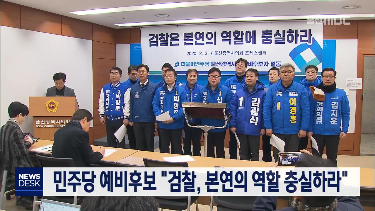 더불어민주당 예비후보들은 오늘(2/3) 울산시의회 프레스센터에서 기자회견을 열고, 4.15 총선을 앞두고 송철호 시장 등 13명을 기소한 검찰이 본연의 역할을 져버렸다고 주장했습니다. 후보들은 검찰이 송 시장 등에게 한 것처럼 김기현 전 울산시장과 고래고기 환부사건 등에 대해서도 엄정하게 수사를 진행해야 한다고 ...