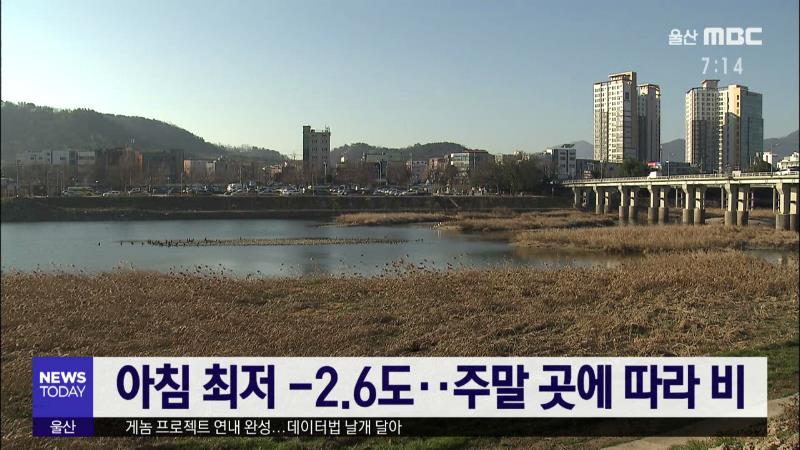 오늘(1/16) 울산지방 구름 많은 가운데 아침 최저 영하 2.6도로 시작해 낮 최고 기온은 8도를 보이겠습니다. 내일도 구름 많겠고 아침 최저 1도, 낮 최고 9도로 평년보다 2도 정도 높은 기온 분포를 보이겠습니다. 울산기상대는 주말인 모레 동풍의 영향으로 낮 동안 곳에 따라 5mm 미만의 비가 내리겠다며 도로 결빙구간의...