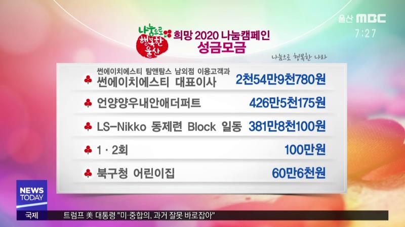 다음은 '희망 2020 나눔캠페인'에 참여해주신 분입니다. 썬에이치에스티 탐앤탐스 남외점 이용고객과 썬에이치에스티 대표이사 2천54만9천780원 언양양우내안애더퍼트 426만5천175원 LS-Nikko 동제련 Block 일동 381만8천100원 1,2회 100만원 북구청 어린이집 60만6천원 -------------------------------------------을 기...