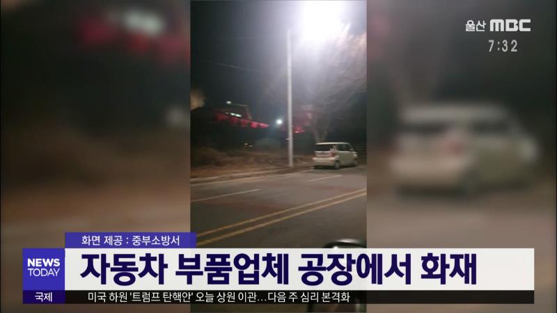 어제(1/15) 오후 9시 17분쯤 울주군 삼남면의 한 자동차 부품 업체에서 불이 나 공장동 지붕과 내부 기계 일부가 탔습니다. 화재는 1시간 10여분 만에 진화됐으며 인명피해는 없었습니다. 소방당국과 경찰은 목격자 등을 상대로 화재 경위와 재산 피해 규모를 조사하고 있습니다.//