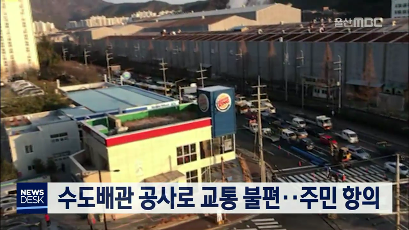 현대중공업이 지난해 10월부터 진행하고 있는 공업용수 수도배관 공사로 교통 불편 민원이 잇따르고 있습니다. 주민들은 배관 공사 차량이 동구 서부동 한채사거리에서 현대고등학교 방면 4차로 가운데 1개 차선 이상을 막아 교통정체를 빚고 있다며 항의하고 있습니다. 이에 대해 현대중공업과 시공사 측은 기존에 배관이 ...
