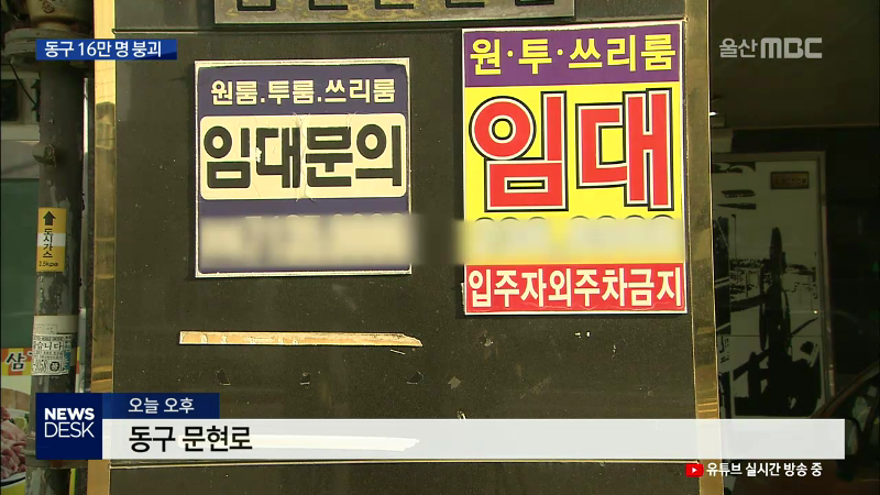 ◀ANC▶ 조선업 불황을 시작으로 동구 인구가 줄고 있는데 지난달에는 내국인 기준 인구 16만명 선마저 무너졌습니다. 동구 상가 공실률은 울산 전체 대비 3배 가까이 높습니다. 이용주 기자. ◀END▶ ◀VCR▶ 현대중공업 해양사업부 바로 옆 문현삼거리에서 꽃바위 종점을 잇는 문현로. 동구 방어동의 중심가인 이 대로...