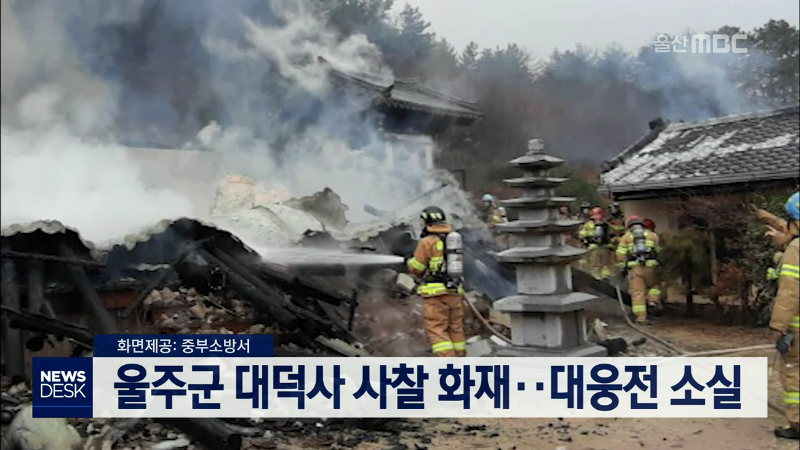 오늘(1/7) 오후 1시 15분쯤 울주군 삼동면 대덕사 사찰에 불이 나 대웅전 전체와 인근의 산시각, 창고 일부 등을 태워 소방서 추산 2천만원의 재산 피해를 내고 1시간 40분만에 꺼졌습니다. 소방당국은 대웅전에서 시작된 불이 옆 건물로 옮겨 붙은 것으로 보고 화재 발생 경위를 조사하고 있습니다. //