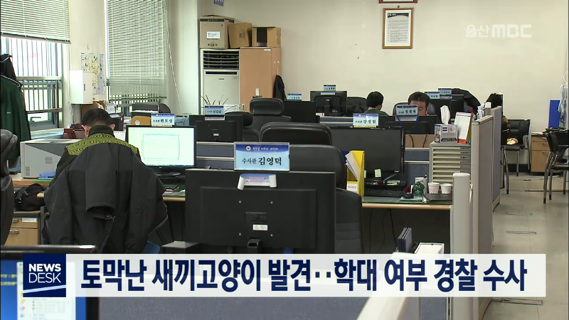 지난달 31일, 울주군 삼남면에서 토막난 새끼고양이 사체가 발견돼 경찰이 수사하고 있습니다. 울산 동네고양이 사랑연대는 죽은 새끼 고양이가 두 토막 나있어 학대가 의심된다고 주장했습니다. 울산울주경찰서는 야생동물에 물린 건지 누가 인위적으로 토막을 낸 건지 육안으로 판단하기 어려워 국과수에 감정을 맡길 계...