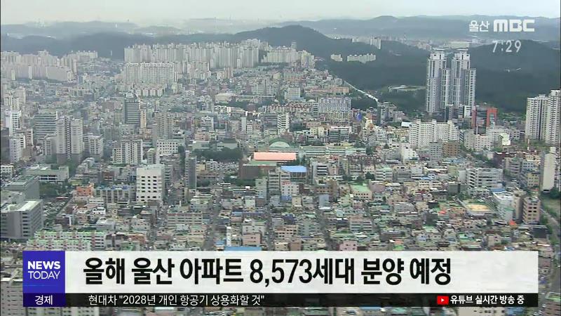 ◀ANC▶ 올해 울산의 아파트 분양 물량이 크게 늘어 8천여세대가 넘을 예정입니다. 현대차가 우버와 손잡고 도심에서 운행할 수 있는 개인용 비행체를 개발했습니다. 경제브리핑, 유영재기잡니다. ◀END▶ ◀VCR▶ 울산 지역 부동산 시장 회복세가 예상되는 가운데 올해 아파트 분양 물량도 대폭 늘어날 것으로 보입니다...