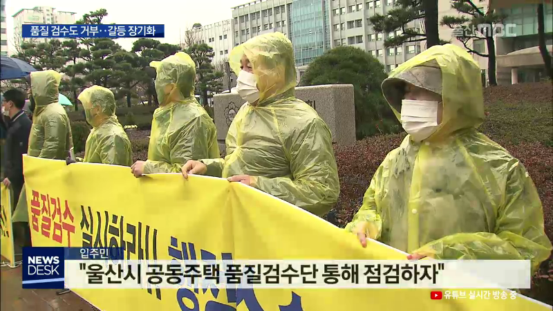 ◀ANC▶ 새 아파트에 입주하는 주민들이 각종 하자 문제 때문에 시공사와 갈등을 겪는 경우가 적지 않습니다. 이런 분쟁을 줄이기 위해 울산시가 사전 품질검수 제도를 운영하고 있지만 시공사가 거부하면 강제로 검수 할 수가 없는 실정입니다. 유희정 기자. ◀END▶ ◀VCR▶ 남구 야음동 대명루첸아파트. 아파트 건물...