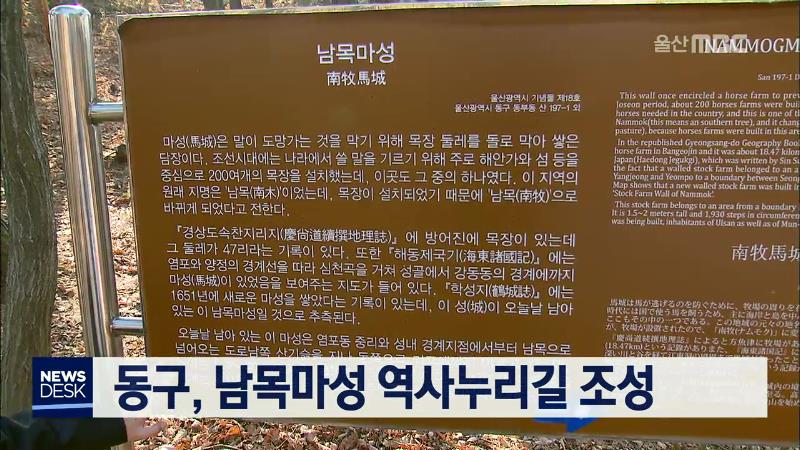 동구가 울산지역 유일한 마성인 남목마성에 역사누리길을 조성합니다. 동구청은 10억원을 투입해 동부동 쇠평마을에서 남목마성까지 2.2km 구간에 감목관 비석을 세우고, 등산로 5곳에 말 모양의 벤치를 조성합니다. 조선시대 군용 말을 키우는 목장이 있었던 동구 남목 지역은 목장 둘레에 돌 담장을 쌓은 마성을 만들고 ...