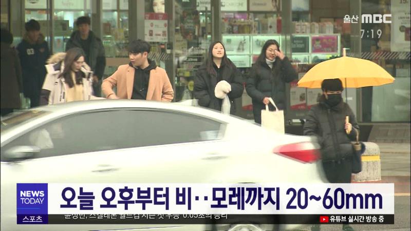 절기상 소한인 오늘(1/6) 울산지방은 흐리고 아침 최저 2도로 시작해 낮 최고 9도의 기온 분포가 예상되며 오후부터는 비가 내리겠습니다. 내일도 비가 이어지겠으며 기온이 다소 올라 8도에서 14도의 평년을 웃도는 기온 분포를 보이겠습니다. 울산기상대는 기압골의 영향을 받아 모레(8) 새벽까지 20~60mm의 강우량을 기...