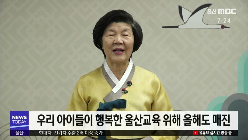 ◀ANC▶ 경자년 새해 인사를 듣는 순서, 마지막으로 노옥희 울산시 교육감입니다. 아이들이 행복한 울산교육을 말했는데요, 들어보시겠습니다. ◀END▶ ◀VCR▶ 안녕하세요. 교육감 노옥희입니다. 새해가 밝았습니다. 겨울 한가운데 새해가 있는 건 어려움과 고난을 이기고 새로운 희망이 자라나기 때문입니다. 우리 아...