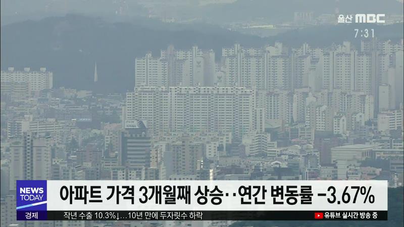 ◀ANC▶ 울산지역 아파트 가격이 최근 3개월째 오름세를 이어가고 있지만, 연간 가격을 보면 여전히 마이너스를 기록하고 있습니다. 이런 가운데 지난해 10월 반짝 감소했던 울산지역 미분양 주택은 다시 증가로 돌아섰습니다. 경제브리핑, 김문희 기자입니다. ◀END▶ ◀VCR▶ 울산지역 아파트 가격이 최근 석 달 연속 ...