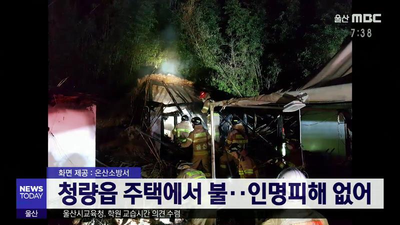 오늘(1/2) 새벽 1시 33분쯤 울주군 청량읍 한 주택에서 불이나 소방서 추산 3백 8십여만 원의 재산피해를 내고 48분만에 꺼졌습니다. 소방당국은 집안의 가스레인지 호스 부분에서 불길이 솟아오르는 것을 봤다는 목격자의 말등을 토대로 자세한 화재 원인을 조사하고 있습니다.