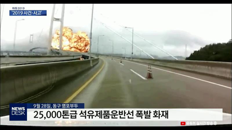 ◀ANC▶ 다사다난 했던 올 한해 울산을 되돌아 보눈 순서, 오늘은 사건사고를 모아봤습니다. 10월말 대형 선박 폭발 화재로 가슴을 쓸어 내렸고, 제2의 윤창호 법에도 불구하고 발생한 음주운전 사고는 시민들의 공분을 샀습니다. 김문희 기자입니다. ◀END▶ ◀VCR▶ 다리로 진입하려는 차량 앞으로 시뻘건 불기둥이 솟...