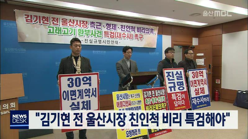 진실규명시민연대는 오늘(12/30) 울산시의회 프레스센터에서 기자회견을 열고 김기현 전 울산시장 측근비리 사건을 특검으로 재수사해야 한다고 주장했습니다. 이들은 김 전 시장 친인척의 요구로 쪼개기 후원금을 낸 당사자에 대한 재판이 조만간 실시된다며, 김 전 시장 동생이 연루된 30억짜리 용역계약서 사건에 대해서...