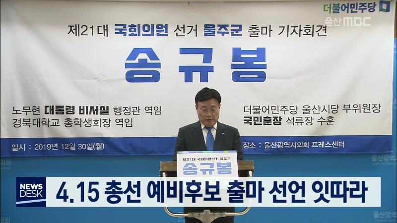 내년 4월 15일 제21대 국회의원 선거가 다가오면서 예비후보들의 출마 선언이 잇따랐습니다. 전상환 바른미래당 울주군 지역위원장과 송규봉 전 노무현 대통령비서실 행정관이 울주군 출마를 선언했습니다. 또 김원배 전 동구의원도 침체된 조선 경기를 되살리겠다며 동구 출마를 선언했습니다.//
