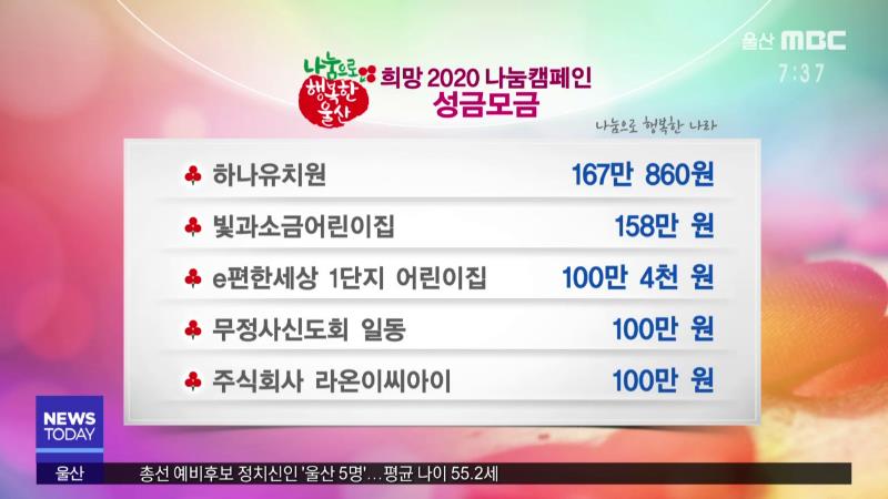다음은 '희망 2020 나눔캠페인'에 참여해주신 분입니다. 효성화학(주)용연공장 3,000만원 아이윤안과병원 1,350만원 사단법인 울산강원도민회 300만원 SK에어가스(주) 200만원 엠엔아이씨(주) 200만원 하나유치원 167만 860원 빛과소금어린이집 158만원 e편한세상 1단지 어린이집 100만4천원 무정사신도회 일동 100만원 주...