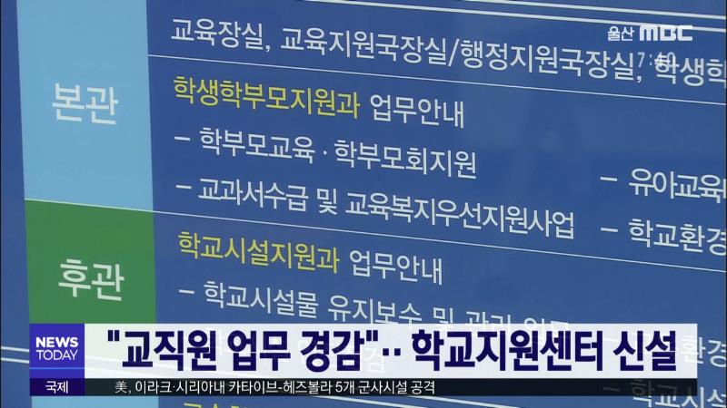 교직원들의 수업 외 업무를 줄이기 위해 학교 업무를 지원하는 학교지원센터가 다음 달부터 운영됩니다. 강북과 강남교육지원청에 각각 설치되는 학교지원센터는 방과후 수업 위탁과 강사 채용, 운동회 같은 교무 업무와 학교 용역 계약, 직원 인건비 취합 등의 행정업무도 함께 처리할 예정입니다. 울산시교육청은 교직원...