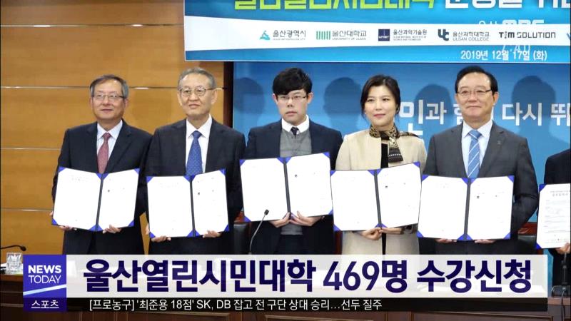 송철호 울산시장의 공약 사업인 울산열린시민대학에 469명이 신청을 마쳐 무난한 출발을 보였습니다. 울산발전연구원에 따르면 전체 수강신청자 가운데 재직자와 일반인이 70%를 차지했고, 연령별로 보면 40대 수강생이 30%로 가장 많았습니다. 울산열린시민대학은 내년 2월23일까지 9주간 시범 운영됩니다. //