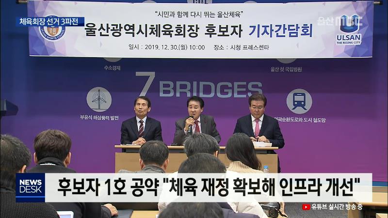 ◀ANC▶ 울산체육회장 선거에 출마한 후보자들이 오늘(12/30) 정책설명회를 열었습니다. 울산시 보조금에 의존하지 않고 자체 예산을 마련해 열악한 지역 체육 인프라를 개선하겠다고 한목소리를 냈습니다. 최지호 기자. ◀END▶ ◀VCR▶ 다음 달 7일 실시되는 울산의 첫 민간체육회장 선거는 3파전으로 치러집니다. 지...