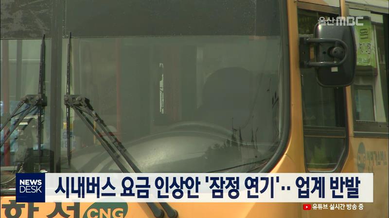 시내버스 요금 인상안이 잠정 연기돼 업계의 반발이 예상됩니다. 울산시는 지난달 7일 대중교통개선위원회에서 운송원가 조사용역 최종 결과를 토대로 시내버스 기준 200원 인상안을 확정했지만, 시의회 정례회에서 해당 안건을 상정하지 않아 요금 인상이 연기됐습니다. 울산시는 바쁜 일정 때문에 요금 인상안을 상정하지...