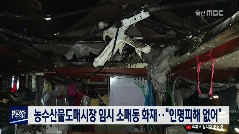 오늘(12/24) 새벽 4시쯤 남구 농수산물도매시장 임시 수산물소매동에서 화재가 발생해 소매동 천막 3개와 집기류 등을 태우고 10여 분만에 진화됐습니다. 소방당국은 인근에 천막 70여개가 있었지만 다행히 불길이 번지지는 않았고 인명피해도 없었다고 밝혔습니다. 소방당국은 목격자 등을 상대로 화재 원인을 조사하고 있...