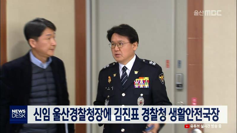 경찰청 치안감 정기인사에 따라 신임 울산지방경찰청장에 김진표 현 경찰청 생활안전국장이 내정됐습니다. 박건찬 현 울산지방경찰청장은 경북지방경찰청장으로 자리를 옮깁니다. 한편 청와대 하명수사 의혹에 연루된 황운하 대전지방경찰청장은 이번 인사에서 경찰인재개발원장에 내정됐습니다.///