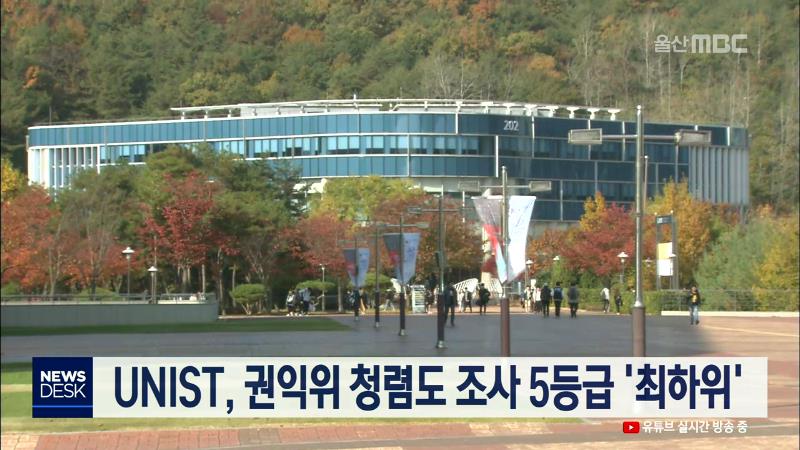 UNIST가 국민권익위가 실시하는 국·공립대 청렴도 조사에서 지난해에 이어 연속으로 최하위인 5등급을 받았습니다. UNIST는 평가 대상인 4개 항목 가운데 조직문화와 연구, 행정에서 모두 5등급을 받아 서울대, 광주과학기술원, 한국과학기술원과 함께 최하위에 머물렀습니다. 반면 전국 35개 국·공립대학 평균 청렴도는 20...