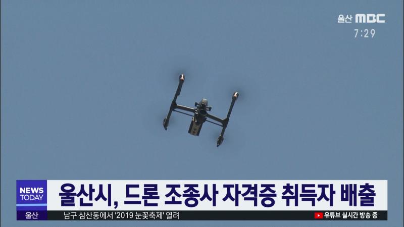 울산시는 시청 토지정보과 공무원 4명이 드론 조종사 자격증을 취득했다고 밝혔습니다. 이재진 주문관 등은 한국교통안전공단에서 실시하는 공공분야 드론 조종인력 양성사업을 통해 3주 교육을 받은 후 자격증을 땄습니다. 울산시는 드론을 공원·하천관리와 산림자원 현황조사 등에 활용할 계획입니다.//